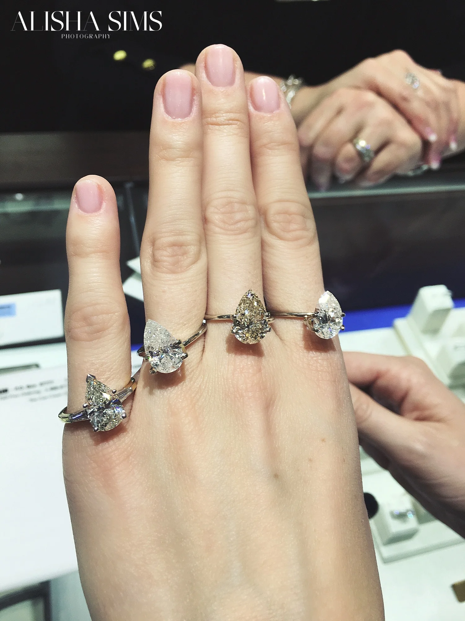 That opened up a conversation with the Diamond Galleria about creating my dream ring and finding the perfect pear-shaped diamond. They gave me control on deciding exactly what I wanted, but guided me where I needed help. Bert, Tyna and Robin provided rose gold samples and Dakota and I worked on the design together. When it came time to pick a stone, Dakota worked with them and they provided four different pear-shaped diamonds for me to choose from. Swoon!!! I felt like a princess. It was a hard choice but after lots of trying on I decided on a favorite.